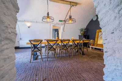 Kazematten is een prachtige, intieme ruimte waar vroeger de soldaten hun slaapvertrekken hadden. De authentieke natuurstenen vloer en witte bakstenen muur geven de ruimte een landelijk en traditioneel uiterlijk. Kaarslicht geeft de ruimte een romantische, warme gloed. Perfect voor een intiem diner tijdens jullie huwelijksdag bijvoorbeeld! De robuuste houten tafels met stalen poten en metalen lampen geven de landelijke ruimte een stoere twist.